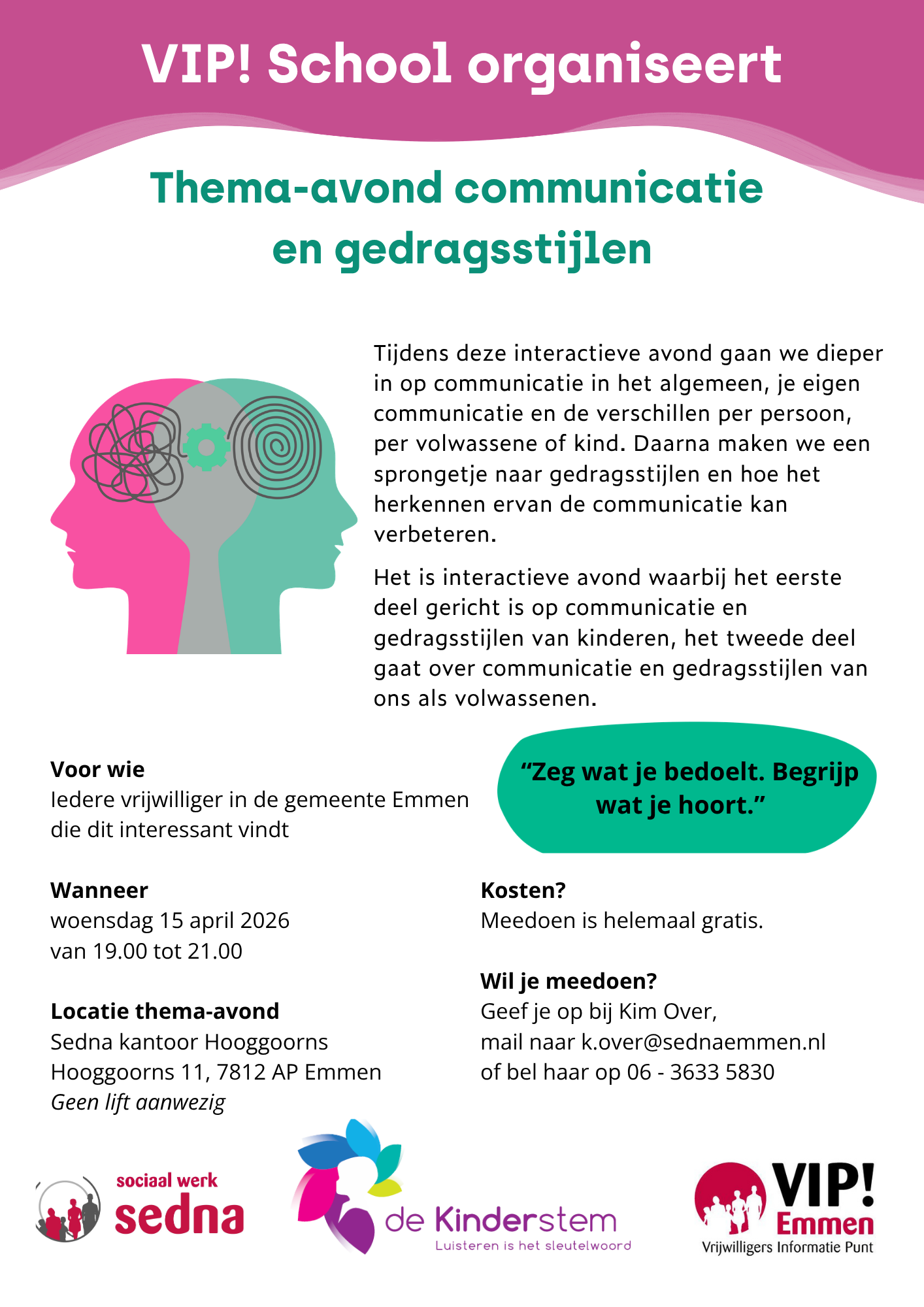 Terug naar VIP School Communicatie en gedragsstijlen bij kinderen en volwassenen Gepubliceerd op: 07-04-2026 13:42 Een interactieve workshop voor alle vrijwilligers Foto's/flyers