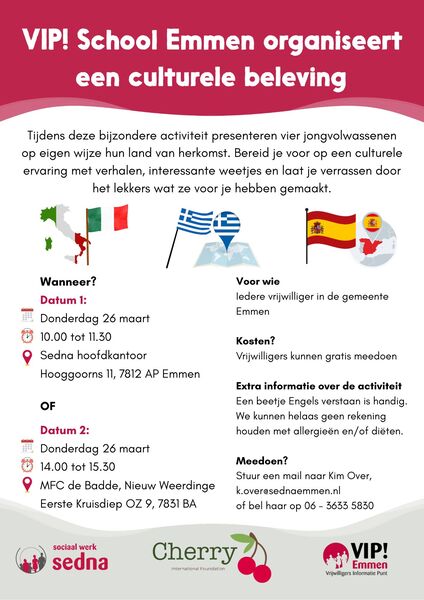 Terug naar VIP School Culturele beleving Gepubliceerd op: 16-03-2026 15:04 Leuke culturele ervaring door 4 jongvolwassenen die van alles kunnen vertellen over hun land. Foto's/flyers Downloads